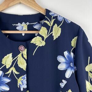 Vintage Floral Button Up Blouse Top Navy Blue Green Short Sleeve Coastal Grandma