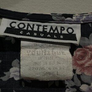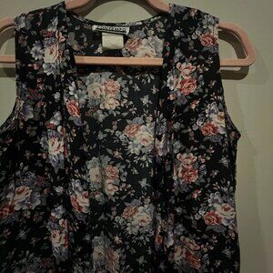 An absolute throwback gem from Contempo Casuals! This sleeveless floral vest features a lightweight black base with an all-over rose and violet print, button front, and long black fringe trim for a bit of drama and movement. It's got that perfect ‘90s grunge-meets-romantic feel. Whether layered over a mini dress or paired with high-rise denim, it’s a vibe.