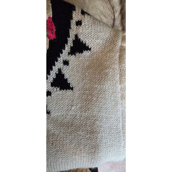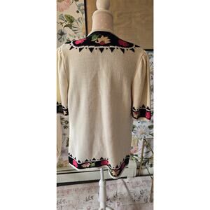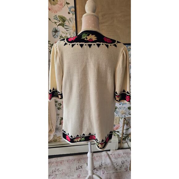 Absolutely gorgeous vintage cardigan from Umi Collections by Ann Crimmins! This late 80's-early 90s cream-colored cardigan features a delightful Swedish folk-inspired floral design in red, green, and soft off-white, all beautifully contrasted against a striking black background.