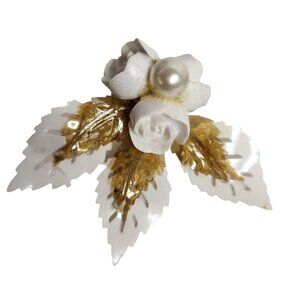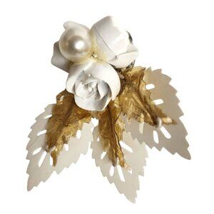 Vintage Floral Clip-On Earrings With White Roses & Gold Leaves Faux Pearl Accent