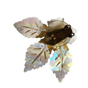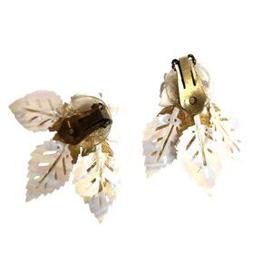 Elegant clip-on earrings featuring delicate white roses, gold-tone leaves, and iridescent mother-of-pearl accents. Stylish and timeless accessory.