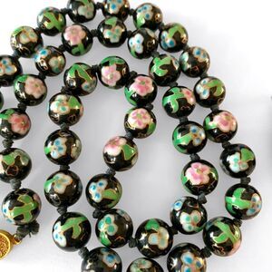 Vintage Black Cloisonné Floral Beaded Hand Knotted Necklace with Matching Earrings.