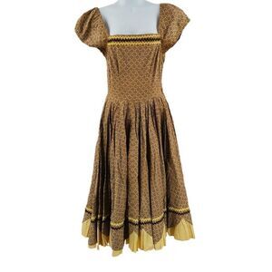 Step back in time with this gorgeous vintage Cottagecore Prairie dress from the 1940s-1950s. Featuring a charming yellow and warm tan floral pattern, this dress exudes romance and elegance with its square neckline, puffed sleeves, and full skirt. Handmade with no brand tag, this dress is a true vintage gem.