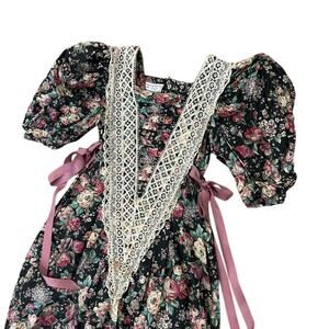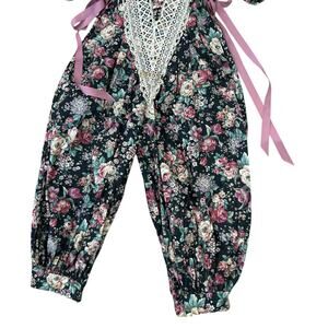 Adorable vintage Abbi Taylor prairie-style jumpsuit in a rich floral print. Features puff sleeves, lace-trimmed bib front, ribbon side ties, and elastic cuffs. Made in the USA, 100% cotton.