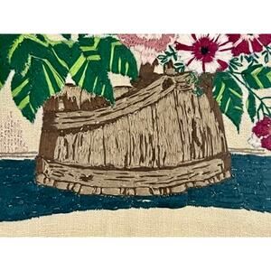 This is a lovely vintage crewel embroidery depicting a vibrant floral arrangement in shades of burgundy, rose, pink, and white, accented with lush green leaves. ca 1970s. The flowers are shown arranged in a rustic wooden basket, stitched on natural linen fabric. The piece is framed under glass with a beige mat and a simple silver-toned frame, measuring 24.5x20.5x0.75".