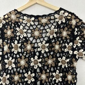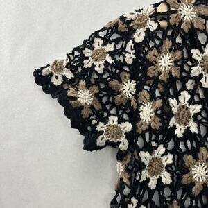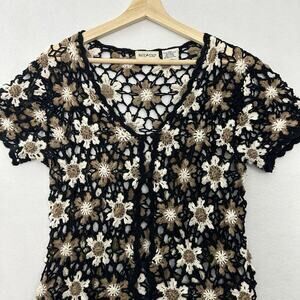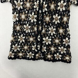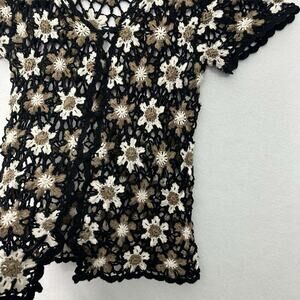 Vintage Floral Crochet Button Up Top Womens L Black White Dark Cottage Flowers