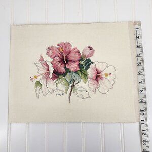 Vintage Floral Cross Stitch Art Signed 1989 Pink Off White Hibiscus Unframed