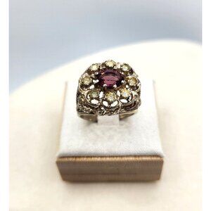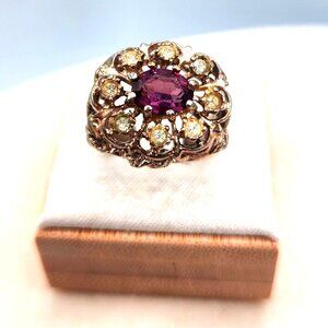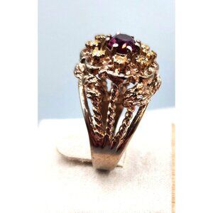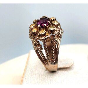 Vintage Floral Design Gold Ring With Garnet & Diamond Accents