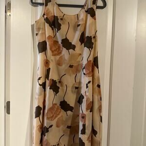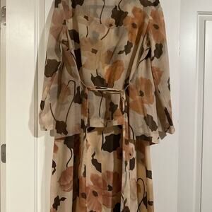 Feminine and so '70s vintage dress set (3 pieces: sleeveless dress, collared, buttoned "jacket" of same fabric with peachy background and burnt orange and brown floral pattern. Includes soft self belt. Dress has round neckline and self piping trim as do the arm holes of the sleeveless dress. Jacket has pointed collar and closure is peach buttons. Semi-sheer fabric. Age is evidenced by no serging. Union sewers label.