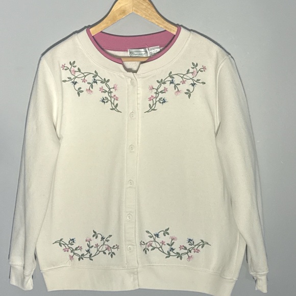 Cream cardigan with floral embroidery. Features button-up front and round neckline.