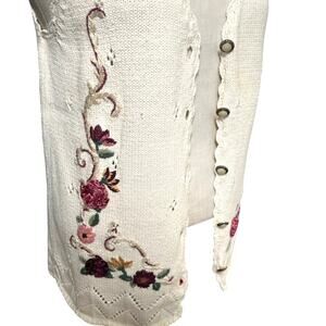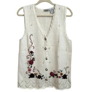 Vintage Floral Embroidered Knit Vest Cream Sleeveless Sweater M Cottagecore