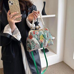 Features: Beautiful embroidered floral detail on a compact, versatile purse that can be carried as a clutch, crossbody, or handheld. Includes a pearl handle and optional leather strap for different styling options. The Kiss Lock closure adds a touch of classic elegance and security.