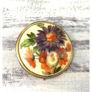 A timeless vintage brooch featuring a vibrant floral enamel design with purple and orange daisies. The gold-tone backing adds a classic, elegant touch.