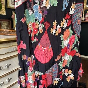 Elegant maxi skirt with a vibrant floral and fan pattern. Features a mix of red, pink, and green on a black background.