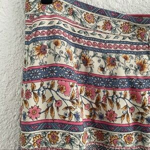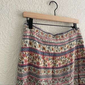 No tags on this piece, but the fabric feels like silk and its in a beautiful floral print and faux wrap style pencil skirt fit. Missing the button in the back above the zipper. Some seam a bit apart on the lining of the interior. Looks handmade! Such a pretty print! Fits like a small, refer to measurement photos for best fit.