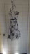 Elegant halter dress featuring a black floral pattern on a white background. Perfect for special occasions.