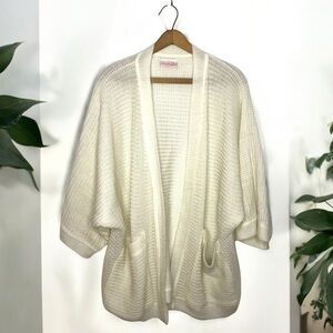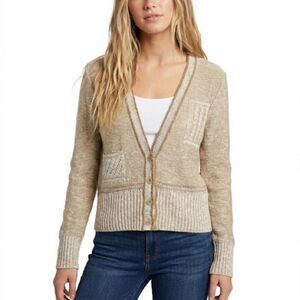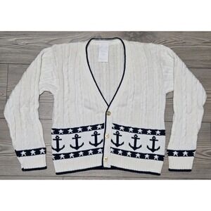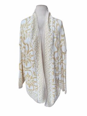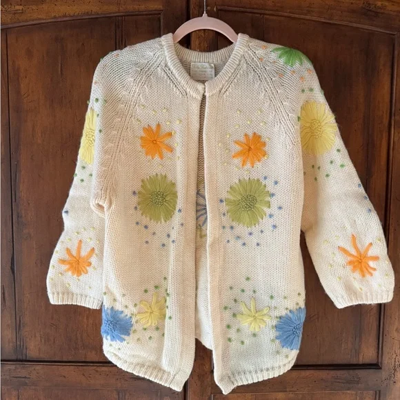 Charming cream cardigan with colorful floral designs. Features orange, blue, and green accents. Ideal for a vibrant look.