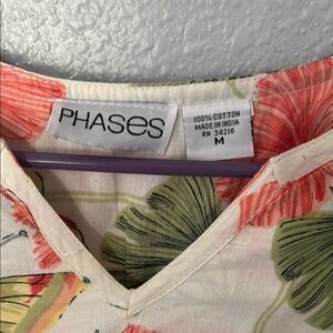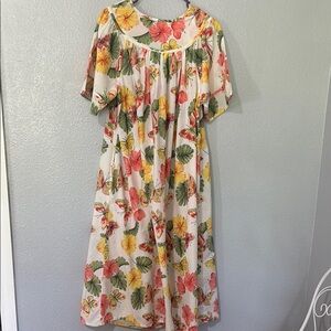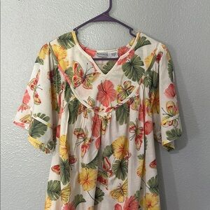 Step into tropical comfort with this vintage Phases cotton dress featuring a vibrant all-over print of hibiscus flowers and butterflies in coral, yellow, and green. This comfy, loose-fit dress has:
