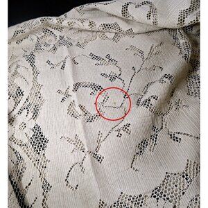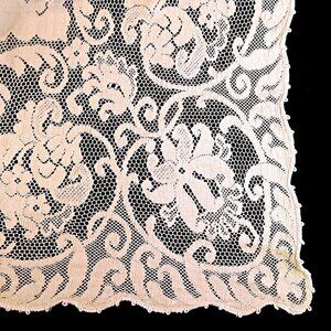 Condition: Clean and intact with softened edges and light toning. Minor wear includes a carefully darned area, a small hole in the mesh, adjacent discoloration, and a frayed hem loop—all consistent with age and use. See photos for details. Ideal for display or repurposing.