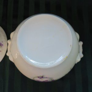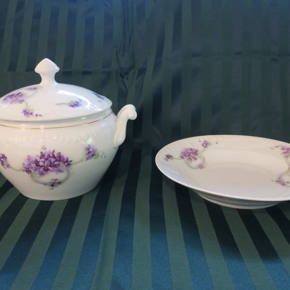 Vintage (no markings) Beautiful Purple Floral Large Covered Dish with Handles and Large Swallow Bowl