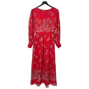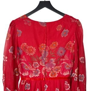 Vintage Kati at Laura Phillips red floral maxi dress with sheer long sleeves, belted waist, and boho silhouette, fits like a women’s small.