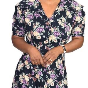 Vintage Maggie Lawrence floral dress FEATURES a button front and purple flower print. Wide pilgrim collar. Short puffed sleeves. V-neckline. A-line skirt. Long maxi length. Granny chic 90s rayon.