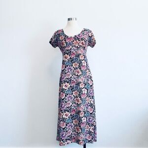 Vintage short cap sleeve, back zipper, scoop neck, empire waist, all over floral print, back tie maxi dress.