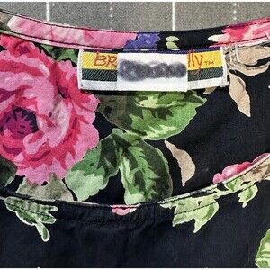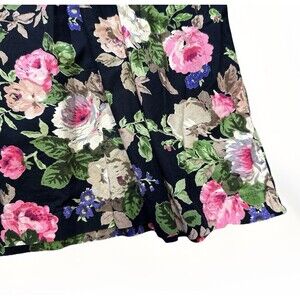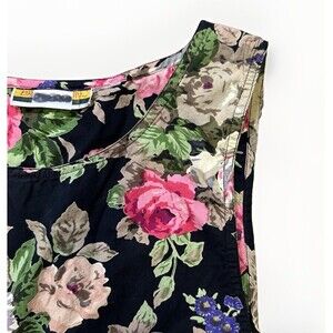 Romantic vintage sleeveless dress with a classic rose floral print on a black background. Fit & flare silhouette with a pleated skirt gives it beautiful movement. Label: Brownstone Studio. Bust 17, waist 15, length 44.5. Perfect for garden parties, retro lovers, or cottagecore vibes.