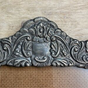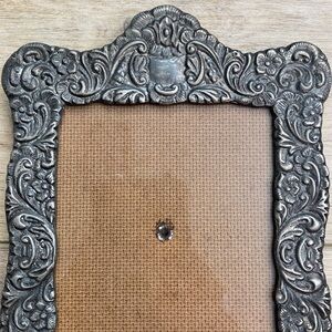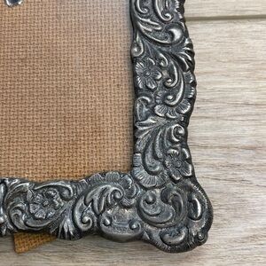 Beautiful Victorian style heavy ornate silver tone metal standing picture frame. A unique boho shabby chic accent perfect for portraits. In excellent condition