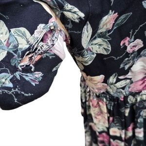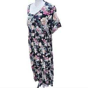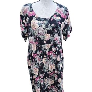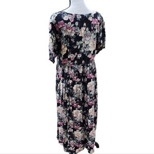 Chic floral midi dress featuring a mix of pink, cream, and green hues on a black background. Perfect for casual outings.
