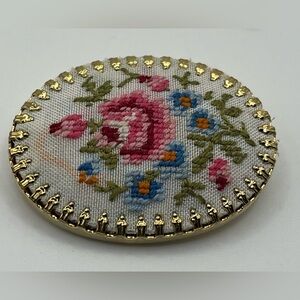 This charming vintage brooch features a delicate hand-stitched needlepoint floral design with pink roses and blue blossoms, set in an elegant gold-tone oval frame. A timeless accessory that adds a touch of classic style to any outfit.