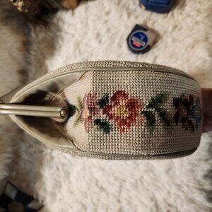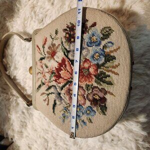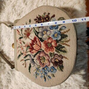 This vintage handbag showcases intricate floral needlepoint craftsmanship. The delicate flowers and sturdy handle enhance its timeless appeal.