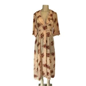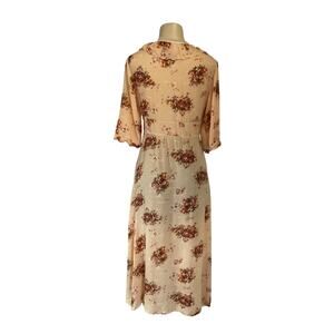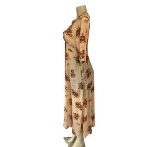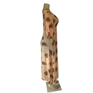This stunning vintage floral garment can be worn as an open front dress or a robe. It features a soft, sheer fabric with a beautiful floral pattern in earthy tones, 3/4 sleeves, and delicate lace trim on the neckline. The front is fully open with no closure, perfect for layering or lounging in style.