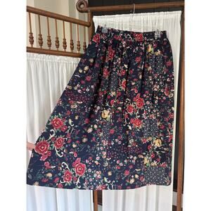 Cute A-line midi skirt in soft cotton blend fabric printed with a floral patchwork on navy background. Print includes roses and calico. Elastic waistband.