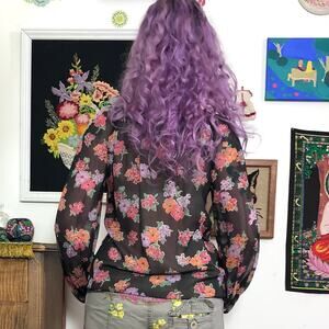 This 70s bohemian dream is made of 2 layers of sheer georgette fabric. The outer layer is dark gray with colorful wildflowers, while the under layer is a light tan color. Even with the two layers, this blouse is still sheer enough to see through, but it puts a hazy layer over whatever you are wearing (or not!) underneath.