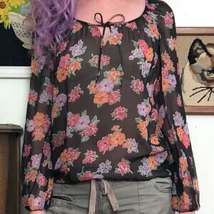 Vintage Peasant Top, 1970s Sheer Floral Georgette Blouse with Tie Closure, Size S-M