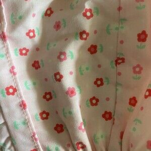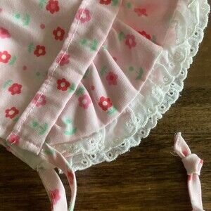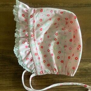 Vintage bonnet, infant/toddler (tag may say 18 months but is very faded), brand unknown. Light pink background with pink/red/white/green floral print, white eyelet lace trim, tie closure, elastic at base, white interior, no flaws.