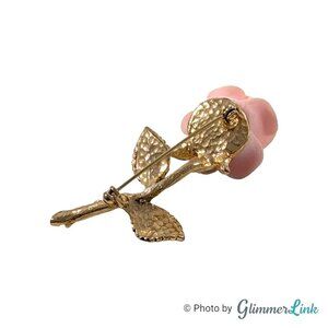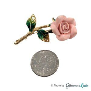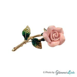 Vintage gold tone brooch featuring an open pink porcelain rose with green enamel gradient leaves.