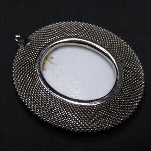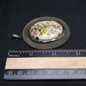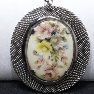 Vintage Floral Porcelain Mesh Frame Pendant, Silver tone, 1960s, 2 3/4 Inches