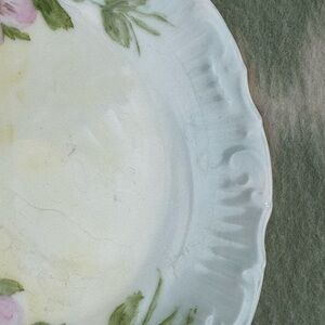 The item is a vintage hand-painted nappy server, likely from the early 20th century. It is made of porcelain and features a floral design with pink and green hues.