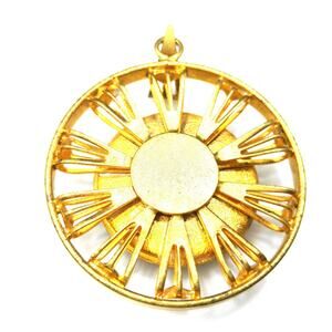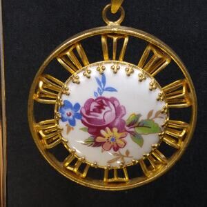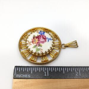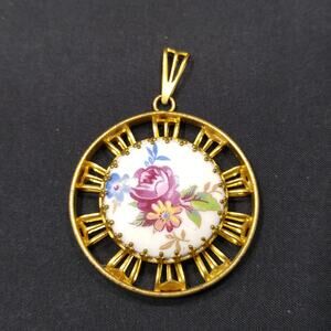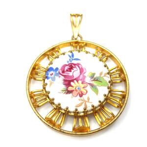 Vintage Floral Porcelain Round Pendant, Gold Tone Frame, 1960s Jewelry
