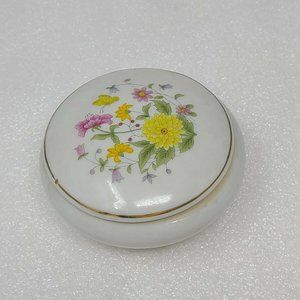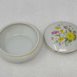 Vintage Floral Porcelain Trinket Jewelry Box Round w/Lid Flowers