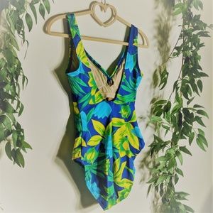 Cool unique vintage one piece swimsuit in a blue, yellow and green tropical print. In excellent vintage condition with little to no visible wear, and a clean lining. Elastic is in great condition.