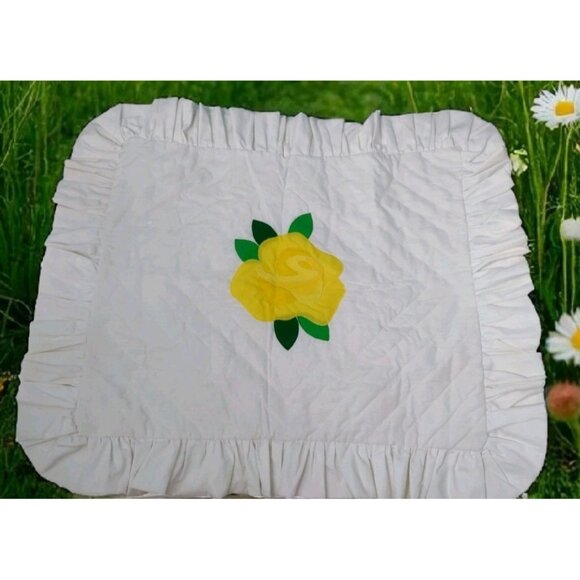 This is a very pretty handmade quilted pillow sham with a ruffle & seen layered yellow flower or rose. Sham measures 26 x 21 & with ruffle measures 33 x 24.