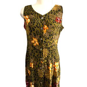 This stunning casual dress is a deep olive green with black Animal Print throughout with multi color flowers in bright popping colors of orange and red.