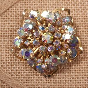 Indulge in the timeless allure of our Vintage Floral Rhinestone Pin, a charming and classic brooch that exudes elegance and grace. Crafted with meticulous detail, this vintage piece features a gold-toned backing adorned with rainbow-colored rhinestones, forming five distinct petals in a mesmerizing floral design.