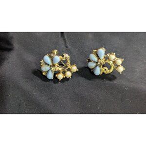 Vintage Floral Screw-Back Earrings With Blue & White Beads Estate