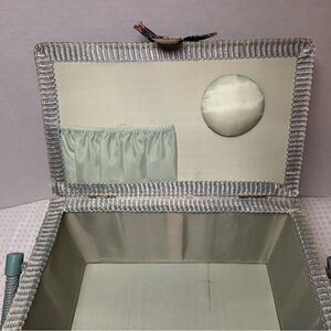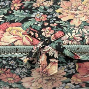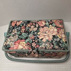 Beautiful floral sewing basket with a sturdy handle. Features a vibrant floral pattern in pink, green, and black.