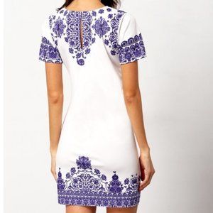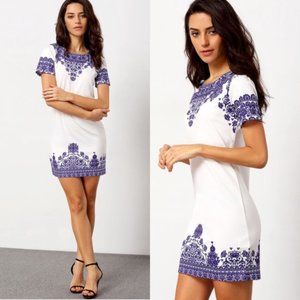 White vintage-floral inspired shift dress with blue floral pattern. Not lined, but material is thicker; may require a slip to prevent see through on white. Worn once. XL, but runs very small. Fits more like a medium.