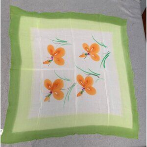 Vintage Floral Silk Scarf Handkerchief with Orange Flowers Green Border